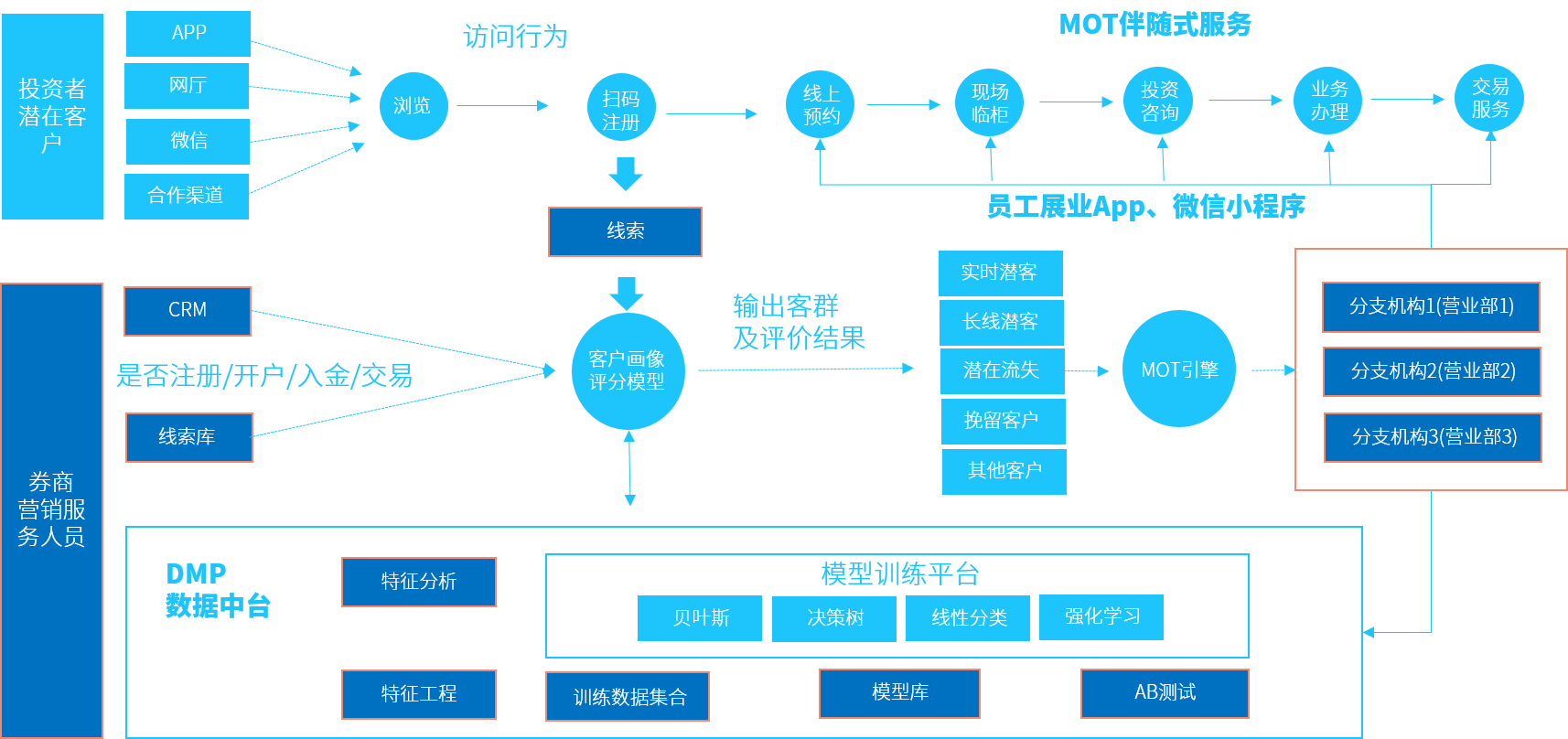 數(shù)字化轉(zhuǎn)型趨勢下,基于凌志DMP客戶畫像產(chǎn)品和MOT引擎產(chǎn)品,配套CRM潛客池和員工展業(yè)App+微信小程序,提供線上線下相結(jié)合的場景化伴隨式服務(wù),幫助券商實現(xiàn)客戶細(xì)分和價值挖掘。