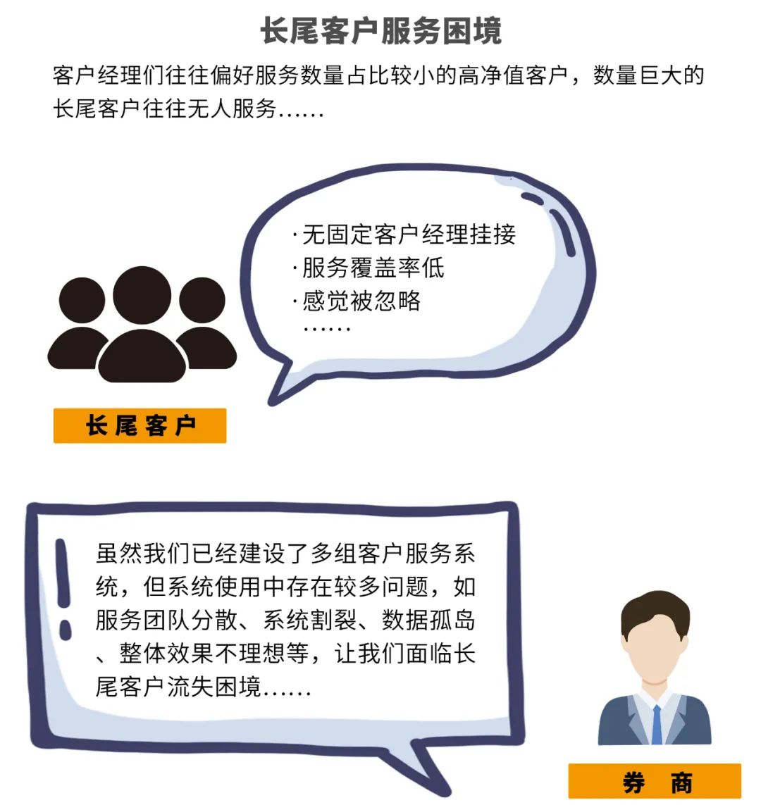 金融科技的應用發(fā)展,推動證券行業(yè)獲客渠道向線上轉變,客戶增加呈跨越式增長。與此同時,數量巨大的客戶與券商有限的服務資源產生的矛盾愈演愈烈,導致大量的長尾客戶(中小客戶)缺乏優(yōu)質服務。