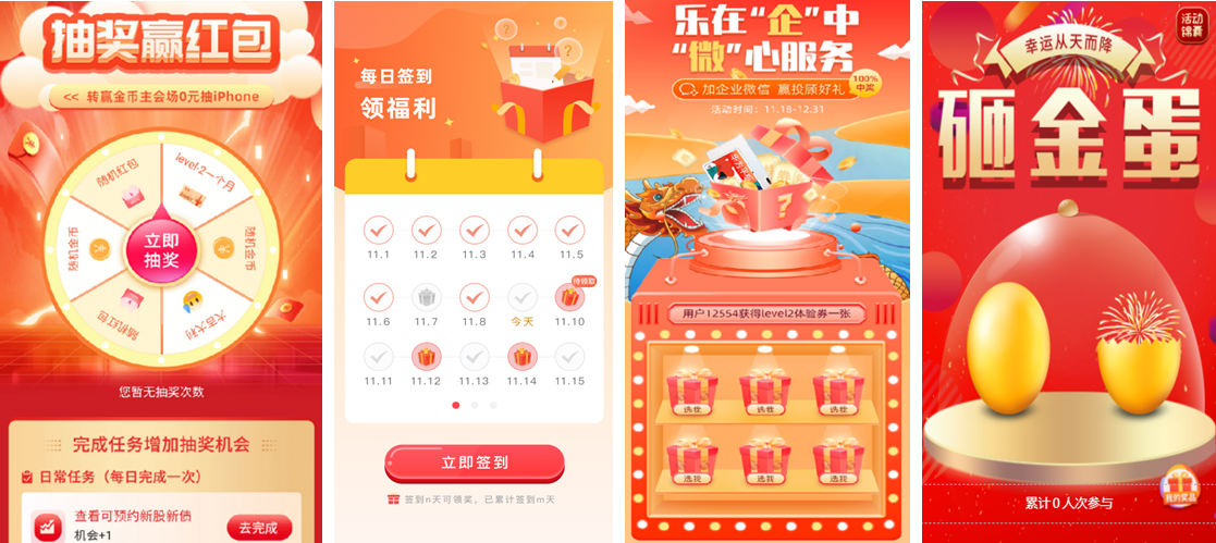 常見抽獎形式包括:大轉盤、砸金蛋、抽盲盒,刮刮卡、打牛頭等,常見獎品為增值服務體驗券、理財折扣券、積分、京東e卡等。
