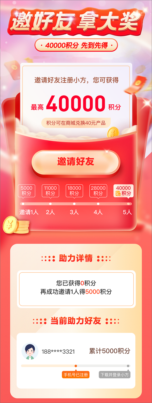 以邀請好友注冊的形式實現(xiàn)裂變活動,通過做任務的方式讓邀請人及被邀請人均獲得積分獎勵從而達到更多用戶注冊的目標。