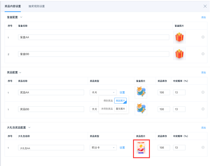 通過拖拉拽的方式放置抽盲盒組件及領獎等組件