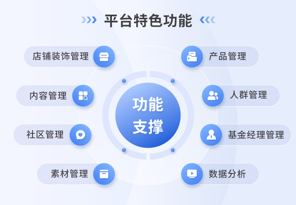 凌志軟件為財富號/財富社區(qū)的建設提供系統(tǒng)解決方案,主要覆蓋用戶前端、后臺管理和基金公司前端的設計三個大模塊,平臺主要特色功能如下: